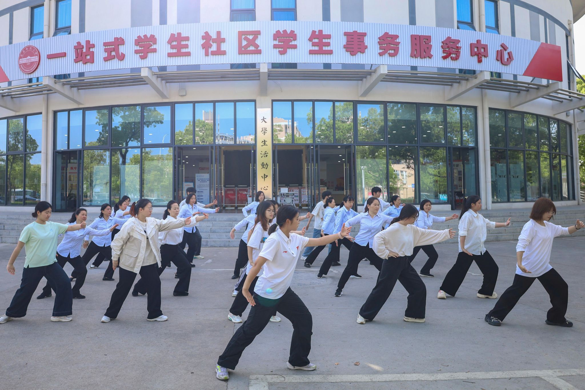 “预备,起势,左右野马分鬃……”4月18日早晨,37000cm威尼斯“一站式学生社区”事务服务中心门前,伴随着舒缓悠扬的音乐声,体育教育专业2023查文婷担任教练,带领30余名宿舍管理员与学生楼长学习24式简化太极拳。