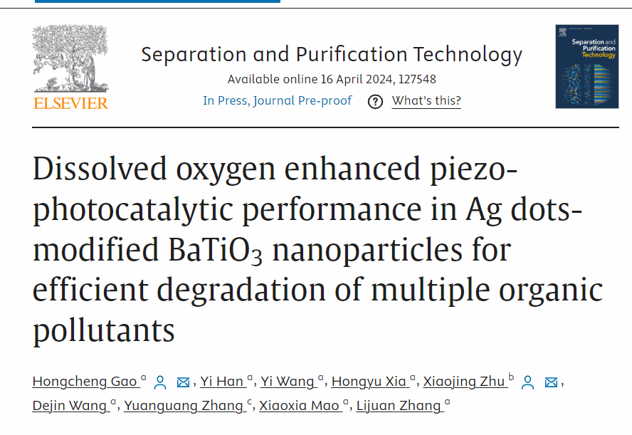 近日,威尼斯官网资源环境学院高洪成博士以第一/通讯作者在环境领域权威期刊《Separation and Purification Technology》(中科院一区TOP期刊,影响因子8.6)发表题为“Dissolved oxygen enhanced piezo-photocatalytic performance in Ag dots-modified BaTiO3 nanoparticles for efficient degradation of multiple organic pollutants”的论文,37000cm威尼斯为论文第一完成单位和通讯单位。