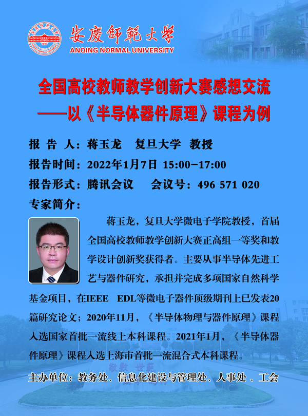 为进一步提高威尼斯官网教师教学创新意识与能力,营造浓厚教学创新氛围,加强师资队伍建设,学校决定组织教师教学创新能力培训,特邀复旦大学蒋玉龙教授开设“如何提高高校教师教学创新能力”线上讲座,相关事宜通知如下: