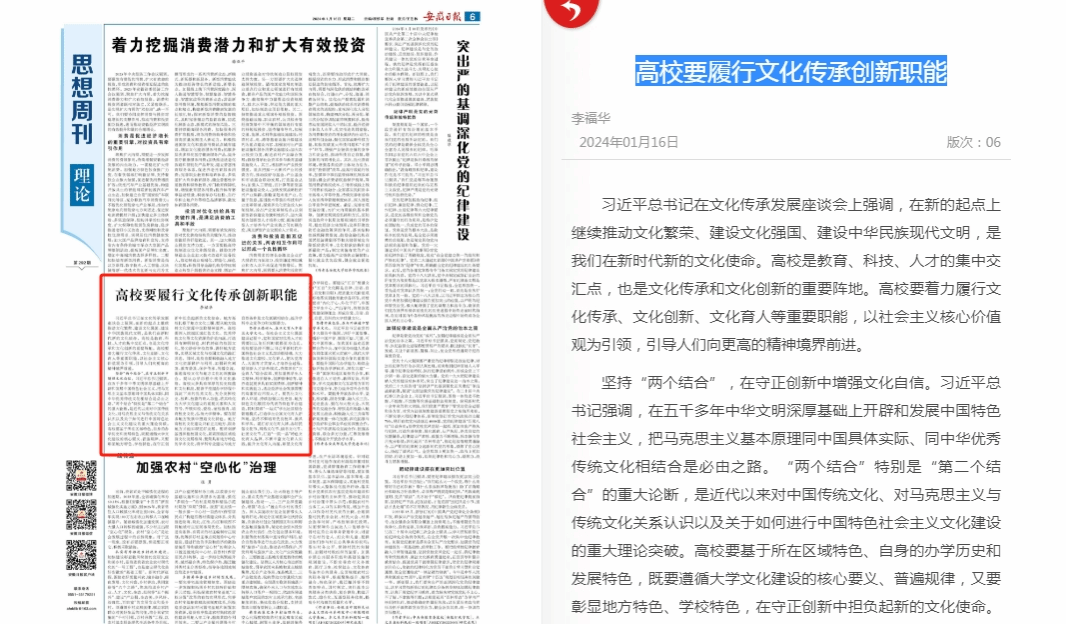 习近平总书记在文化传承发展座谈会上强调,在新的起点上继续推动文化繁荣、建设文化强国、建设中华民族现代文明,是我们在新时代新的文化使命。高校是教育、科技、人才的集中交汇点,也是文化传承和文化创新的重要阵地。高校要着力履行文化传承、文化创新、文化育人等重要职能,以社会主义核心价值观为引领,引导人们向更高的精神境界前进。