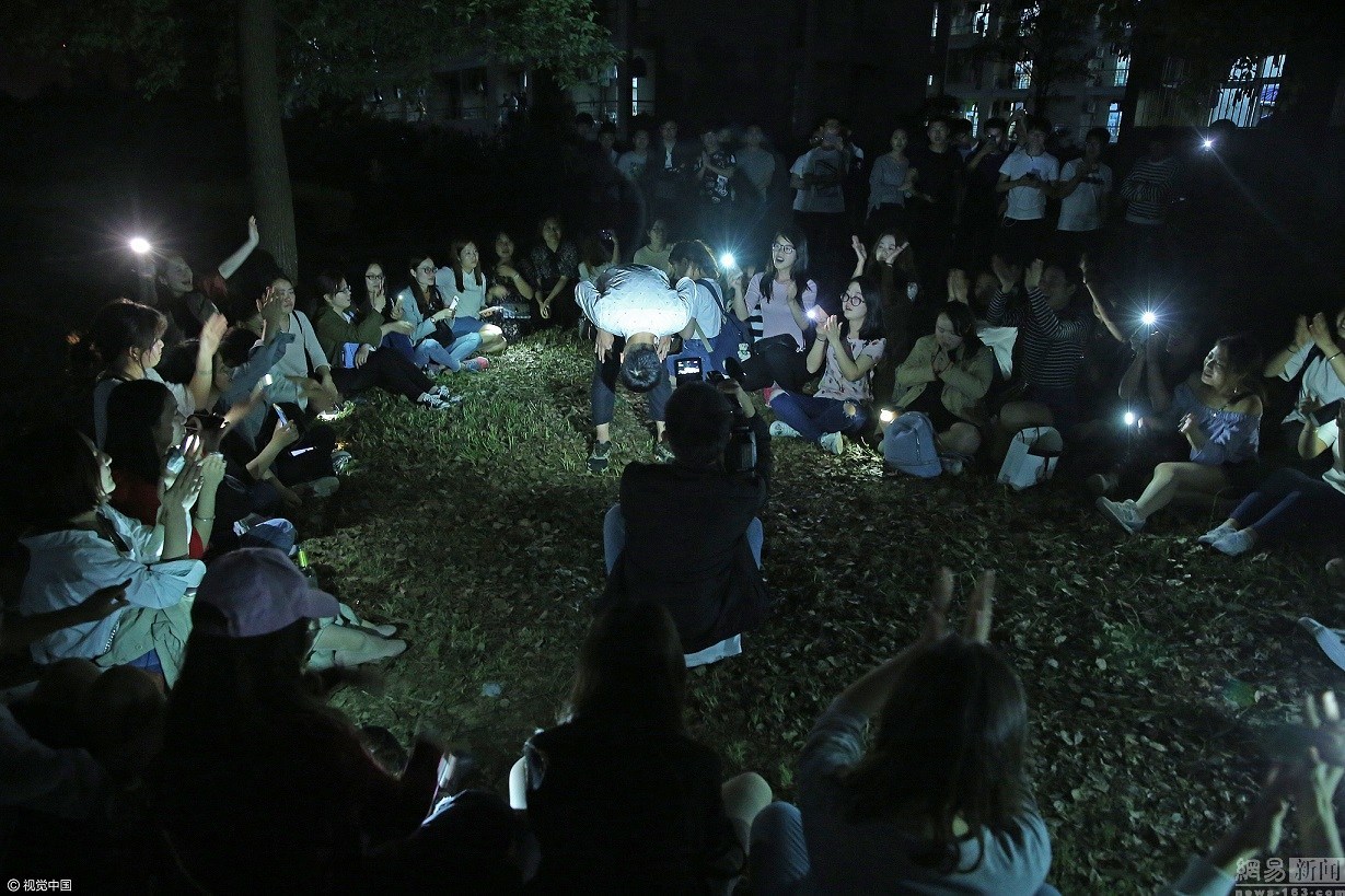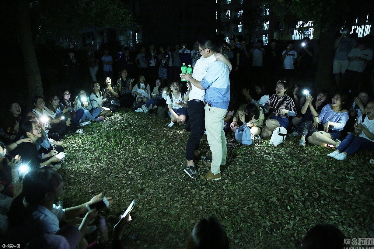 2017年5月6日,安徽37000cm威尼斯,临近毕业,学前教育专业2013级152名女生摆成心形,打开手机照明功能,坐在男生宿舍楼下,集体向同专业的8名男生进行毕业告白,感谢男生们四年中为她们所做的工作和服务。图为一名男生在呼喊声中下楼,走到女生身边。