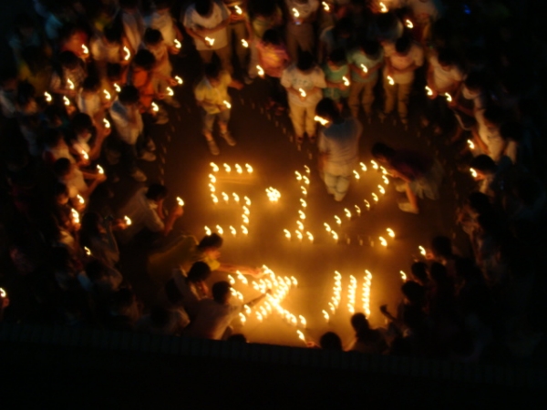 5月19日晚9点30分,2007级资源环境2班在菱湖校区教学楼前为四川地震遇难同胞举行哀悼仪式!同学们用蜡烛在地上摆出“5•12汶川”字样,并且拉出“深切悼念地震遇难同胞”的横幅。同学们为遇难者默哀300秒。