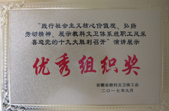 9月24至25日,安徽省教科文卫体工会“践行社会主义核心价值观、弘扬劳动精神、展示教科文卫体系统职工风采,喜迎党的十九大胜利召开”演讲展示在合肥举办。威尼斯官网体育学院鲁雷老师以《用心灵照亮人生》为题的演讲获得三等奖,同时威尼斯官网工会获得优秀组织奖。