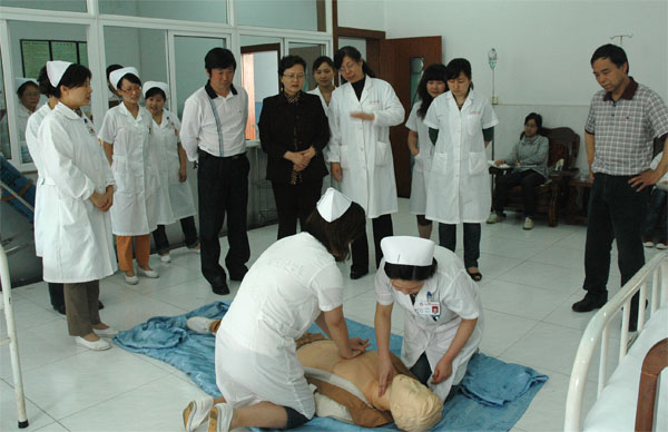 殷红同志首先代表学校党政领导班子,向校医院医护人员致以节日的祝贺,并送上了鲜花和慰问金。她对校医院医护人员多年来以病人为中心,甘于奉献、救死扶伤、勇于献身的工作精神,特别是热情服务师生员工,为师生员工的健康所作出的努力给予了高度肯定,并勉励她们在今后的工作中爱岗敬业、恪尽职守、不辱使命。慰问中,殷红同志还兴致勃勃地观摩了校医院专门为庆祝护士节开展的“心肺复苏”急救技能练兵活动,并观看了新购进的全自动生化分析仪、全自动血细胞分析仪、尿液自动分析仪、离心机等仪器。