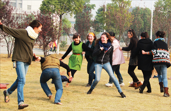 为了配合美国交流生完成他们的旅行学习,11月11日文学院选派了15名对外汉语专业的学生,对交流生们每天进行两个小时的 “一对一”辅导。教学的内容和方式,均由外汉专业的学生自己设计。“我是采取ppt展示的方式,向他介绍一些关于中国节日和中国传统习俗的小常识,一些生动有趣的图片更能增加他对上课内容的理解。”汉语国际教育专业13(2)班的刘滢说。而来自大三的王新慧则是选择立足于美国交流生的汉语教材,教他们一些打招呼、问路等比较实用的日常交流用语。“一对一”辅导之后,交流生们被分到不同班级,与威尼斯官网学生进行一小时的课堂交流学习。