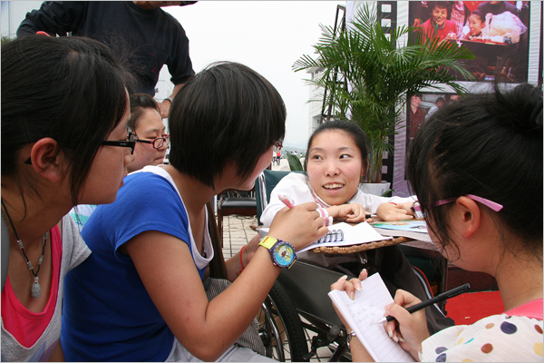 活动现场气氛热烈,刘璟这个校园明星和同学们开心的畅谈着,她热情地回答着大家提的每一个问题。手机号、QQ号,一遍又一遍地说着,乐此不疲。尽管额头上沁出滴滴汗珠,灿烂的笑容依然是她最美的标志。
