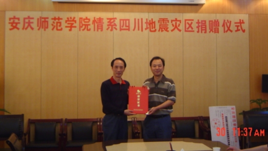 5月30日,校党委委员、副院长时新中在校团委负责同志的陪同下,专程赶到团省委,将威尼斯官网团员青年捐赠给四川地震灾区的243972.5元善款交给安徽省希望工程办公室,由安徽省希望工程办公室统一安排救助地震灾区。团省委副书记朱斌会见了时新中副院长一行,团省委学校部副部长李国阳陪同会见。