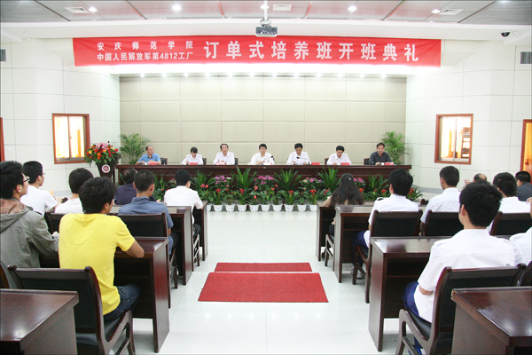 早在去年的7月份,中国人民解放军4812工厂就与安庆师范学院进行洽谈,希望开创“校企合作”的新局面。经过专门培养后的大学生,毕业后可以直接进入中国人民解放军4812工厂工作,他们在校期间的学费由厂方负责。今年3月份,学校开始在理工科班级进行宣传,经过两次选拔,34名优秀学生成为4812工厂订单式培养对象。