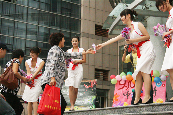 9月10日早上,在龙山校区,前来上班的教工们刚刚从校车上下来,一群手持康乃馨的学生立即上前,为他们一一送上节日的祝福。同时间,在菱湖校区,前往教学楼上课的老师们也享受到了同样待遇。这是校团委发起的教师节系列活动之一。