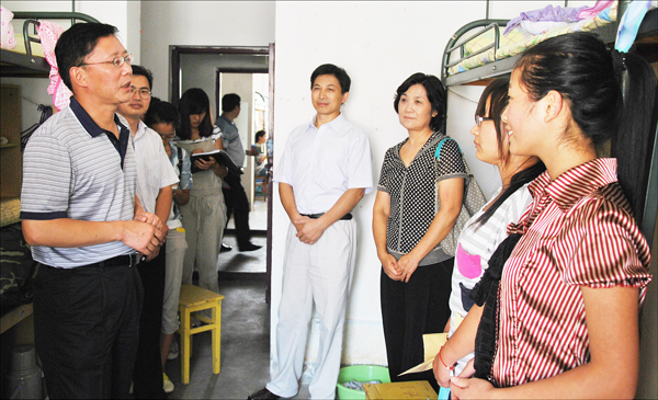 当天上午8点30分,离约好的时间9点还有不短的时间,何小祥书记就来到了化学化工学院办公室,准备在学生处、化学化工学院等部门负责同志的陪同下,前去看望孤儿大学生袁淮。因为何书记最近腿上旧伤发作,腿上还贴着膏药,上下楼不太方便。学生处和化学化工学院的领导都建议何书记,就在办公室见一下学生,不要去爬六楼了。但是何书记却说,“不,我们一定要去看看她,看看她还有什么困难!”。
