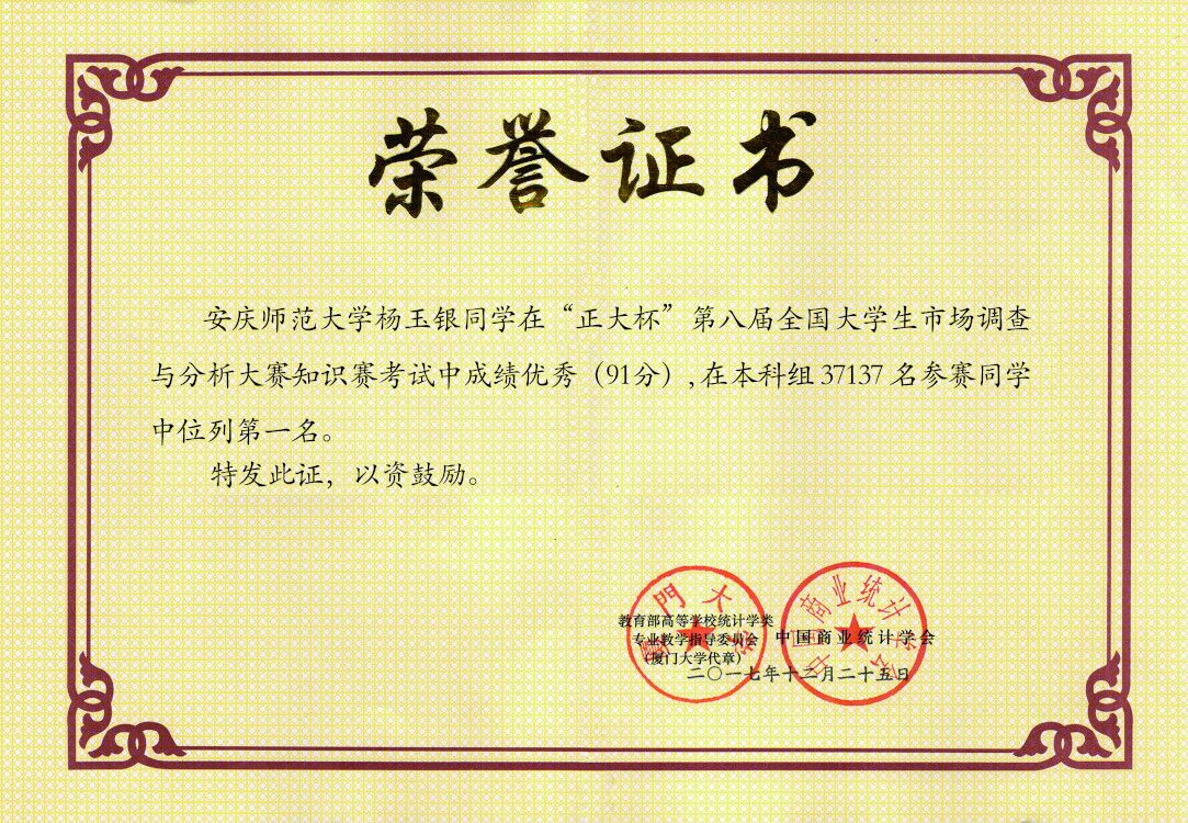 日前,“正大杯”第八届全国大学生市场调查与分析大赛知识赛成绩揭晓,威尼斯官网2015级应用统计学2班杨玉银同学在本科组37137名参赛选手中位列第一名。