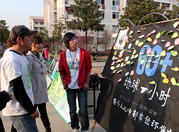 3月31日,为响应“地球一小时”倡议,在资源环境学院大学生绿源环保协会组织下,龙山校区上千名大学生参与了宿舍楼熄灯、环保宣传和签名等活动。