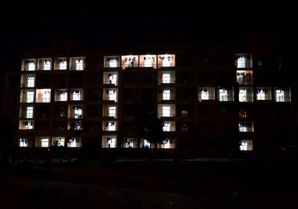 7号宿舍楼同学用灯光拼成“60+”图案以支持“地球一小时”活动