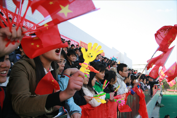 三天的参赛中,看台上的啦啦队、场外遮阳伞下的服务队,是一道别样的风景,音乐学院的同学们甚至把爵士鼓带到了现场助威。“我们班从早上七点多就过来,每个同学都有小手拍、红旗、小喇叭和自制的加油工具,我相信我们人教班的兄弟姐妹们是最棒的,我们的口号是‘人教合心,勇冠全军’”人文与社会学院人文教育专业10级的班长宋明亮激动地喊到。他们班的徐旭秀接着说,“虽然天气很冷,但我们越喊越暖和,人文与社会学院的同学都是最棒的。”运动场内喊声阵阵,运动场外也十分热闹,来自16个学院的后勤接待点在体育场外一字排开,矿泉水、开水、休息桌椅和各种体育器材一应俱全。“我们九月底就开始组织运动员训练,他们很辛苦,所以我们要尽我们最大的努力给他们提供帮助,让他们感到我们的关心、我们的支持。”教育学院学生会主席王子鸣向我们表达了他们的服务理念。运动会举行了三天,后勤接待点也在场外设立了三天,他们及时掌握运动员的最新情况,为他们送上最温暖的服务,做最坚强的后盾!