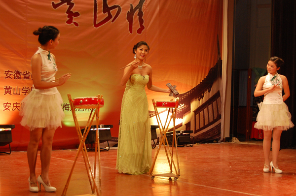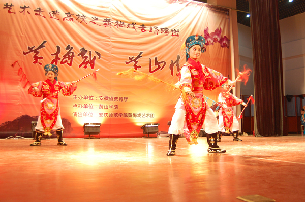 演出在《鹊桥》优美圆润的乐曲声中拉开帷幕,精彩绝伦的黄梅戏传统剧目、经典曲目、现代曲目轮番上演,为黄山学院的广大师生献上了一场高雅丰富的艺术盛宴。其中,《路遇》、《表花名》、《海滩边》、《闹花灯》等传统节目深受观众的喜爱,全场掌声雷动;《黄梅大鼓》、《剑舞》、《变脸》等节目以丰富多彩的形式、精湛的艺术表演使现场的观众欢呼不断;应广大师生的盛情邀请,黄梅戏表演艺术家、安庆师范学院兼职副教授潘启才老师和黄山学院艺术系江伟老师合唱了《夫妻双双把家还》,博得满堂彩。整个演出高潮迭起,掌声不断,最后,演出在全体演员表演的《黄梅精粹联唱》中顺利落下帷幕。
