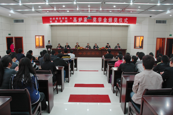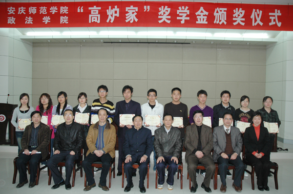 在颁奖仪式上,政法学院党总支副书记余精华介绍了《安庆师范学院政法学院“高炉家”奖学金评定办法(试行)》,宣读了《安庆师范学院政法学院关于颁发2008-2009学年“高炉家”奖学金的决定》。朱士群院长、时新中副院长和马锦华总裁向获得首届“高炉家”奖学金的12名同学颁发了获奖证书。获奖同学代表张娅在发言中,对马锦华总裁和安徽双轮酒业有限责任公司表示诚挚的谢意,表示一定要努力学习,奋发图强,不辜负学校和安徽双轮酒业有限公司的关怀和厚望,以优异的成绩回报社会,报效祖国。