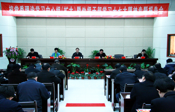 12月6日下午,校党委理论学习中心组在龙山校区行政楼一楼会议室召开扩大会议,党委副书记、院长汪青松教授为全校处级干部作题为《中国特色社会主义理论体系解读》的十七大学习辅导报告。党委书记赵晓和,党委委员、副院长时新中、王海燕,党委委员、纪委书记殷红,副院长张群等领导与全体处级干部一起聆听了报告。