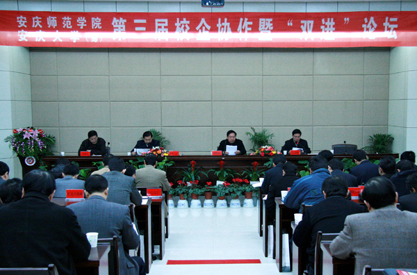 12月7日上午,由安庆市人民政府、安庆师范学院共同举办的第三届校企协作暨“双进”论坛在威尼斯官网龙山校区行政楼一楼会议室隆重召开。中共安庆市委常委、安庆市副市长袁方,安庆市副市长方祖中,安庆市教育局局长江兴代,共青团安庆市委书记王爱武等领导以及安徽华茂集团、中国石油化工股份有限公司安庆分公司、安徽省电信有限公司安庆市分公司等企事业单位的代表应邀出席了论坛。