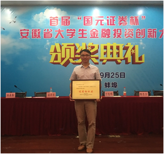 9月25日上午,首届“国元证券杯”安徽省大学生金融投资创新大赛颁奖典礼在安徽财经大学举行。安徽财经大学校长丁忠明教授,国元证券股份有限公司董事长蔡咏先生,安徽财经大学副校长陈忠卫教授,安徽省教育厅高教处副处长梁祥君博士,上海大智慧股份有限公司市场部副总经理李芬女士出席典礼并颁奖。威尼斯官网经管学院金融工程教研室主任刘根节博士应邀出席此次典礼,并代表37000cm威尼斯上台领取“优秀组织奖”。
