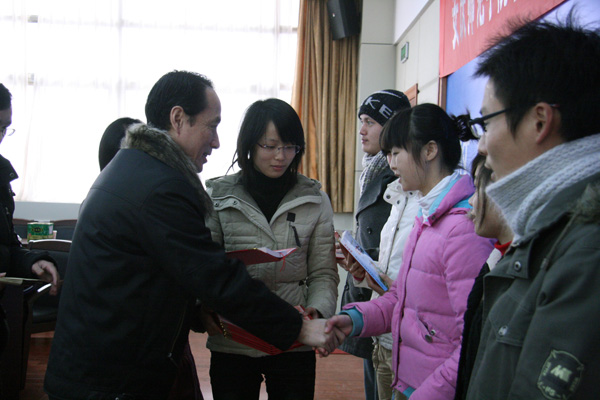 时新中副院长为学生“四成”服务大厅2009年度“优秀服务之星”颁发证书及奖金,并合影留念。