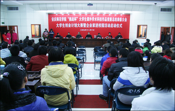 12月10日下午,威尼斯官网“挑战杯”大学生课外学术科技作品竞赛总结表彰大会、大学生创业计划大赛暨企业家进校园活动启动仪式在龙山校区行政楼一楼会议室隆重举行。校党委书记赵晓和,党委副书记、副院长朱士群,党委委员、副院长时新中、王海燕、闵永新,副院长张群,党委委员、党办、院办、外事办主任、生命科学系党总支书记刘友忠出席会议。各院系党政负责同志,教务处、学生处、科技处、学科建设与研究生教育处、团委等部门负责人以及教师学生代表200余人参加了会议。安徽舒信商业管理有限公司、安徽舒怡建设集团副总裁吴为先生一行也应邀参会。仪式由团委副书记刘燕主持。