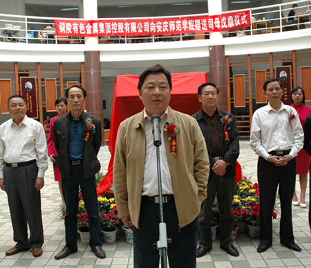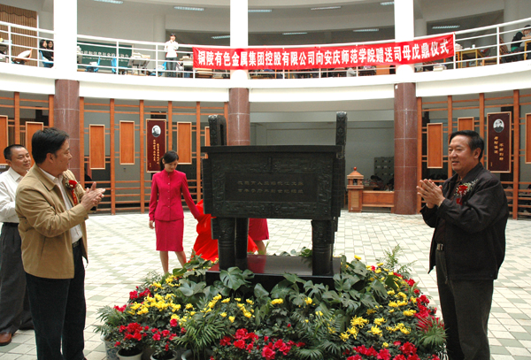 铜陵有色金属集团控股有限公司党委书记、副董事长方国太同志在仪式上发表讲话。他首先代表集团公司对威尼斯官网举行盛大的揭幕仪式表示感谢。他认为,安庆师范学院是省内办学历史最为悠久的一所大学,有110余年里为安徽和全国的教育事业作出了不朽的贡献,特别是改革开放30年来,学校发展速度非常迅速,已经取得了举世闻名的成就,为此,铜陵有色金属集团控股有限公司专门制作了此鼎以表祝贺之情。他指出,铜陵有色金属集团和安庆师范学院地相近,人相亲,长期以来,安庆师范学院领导和老师对铜陵有色金属集团在安庆的两矿一厂给予了高度的关注和支持,为公司输送了大量的管理、技术和文职人员,为铜陵有色金属集团近些年的快速发展做出了巨大的贡献。他希望铜陵有色金属集团公司和威尼斯官网的友谊能像青铜文化一样源远流长,祝愿学校的明天会更加美好。