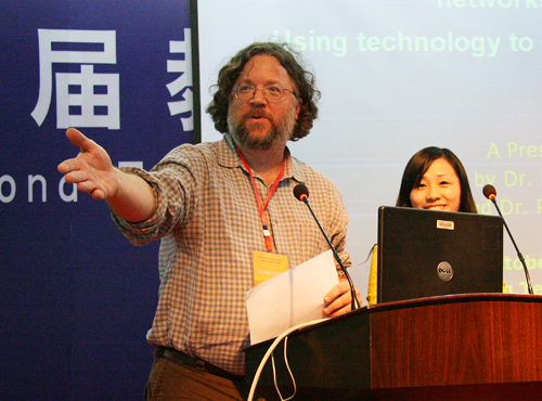 来自美国明尼苏达大学的Harkins 博士作了关于《超越提升的原则和实践:3-4级教育的核心组成》的专题演讲。Harkins 博士介绍了他的越级提升的原则理论。他认为,越级提升的原则和实践是作为三级教育(知识产出型教育)和四级教育(知识创新型教育)的组成而被提出和阐明的。他的分析把整个世界作为一个讨论的背景,他从技术角度将人类历史社会分为六种形态,即原始社会、农业社会、工业社会、信息社会、知识社会和创新型社会,试图从古今社会结构及模式变化探讨超越障碍、从过去到现在、甚至于从过去到未来、未来到现在的互动模式,他认为,如何帮助学生从被动到参与社会文化构建,如何有效地获取信息、寻求一种从混沌到秩序统一的方式非常重要。