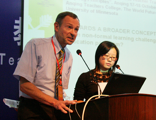 来自芬兰专家Lauri Yrjo Johannes Siurala作了关于《教育中的正式学习和非正式学习》的专题演讲。Lauri Yrjo认为,课外学习,即非正式学习可以很好地帮助课堂上学习,在教育体系二者应该统一。他反思了芬兰2006年和2008年发生的几起校园枪杀的事件,认为是芬兰现行的教育体系出了问题,在芬兰的教育体系中,尽管在正式教育方面做得很成功,但是在非正式教育方面却有所欠缺。正式的教育在建构人的健全人格体系中存在着不足,即在课堂上的正式教育侧重对于知识的传播,而忽视对于一个健全人的社会能力的培养,如社会交往、参与政治、尊重社会道德等。非正式的教育,可以帮助学生改善学生社会的生存技巧和生存能力。Lauri Yrjo还就如何在网络时代的非正式学习模式,将网络虚拟的社会实践与真实社会实践结合,作了相关说明。