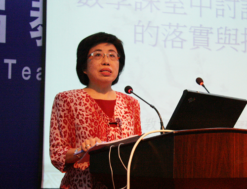 来自台湾教育大学数学教育研究所钟静教授作了关于《数学课堂中讨论式教学的落实与推广》的专题演讲。钟静教授认为,讨论式教学强调师生互动,相对而言于单向式的讲述教学,讨论式教学是以社会建构理论、脚手架理论等为基础的。在数学课堂中的讨论式教学是启发和引导数学意义的协商,着重了解学生个人对数学家意义的认识,促使学生建构数学知识,将已有的具体活动经验类型抽象化,进行对学生有意义的引导、再发明。教师教育进行的讨论式教学并非即知即行,需要经由实务社群的共同探讨,并结合理论与实践,教师要先掌握教材脉络,在学生中建立讨论文化。对于讨论式教学推广问题,钟静教授认为,则需要经点、线、面的落实。