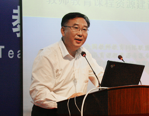 高等教育出版社教师教育分社社长王宏凯先生作了关于《教师教育课程资源建设》的专题演讲。王宏凯社长简要介绍了全国教师教育课程建设委员会以及高等教育出版社的概况,并提出力争使高等教育出版社成为优质资源的建设者,资产集成的运营者以及教学服务的提供者。