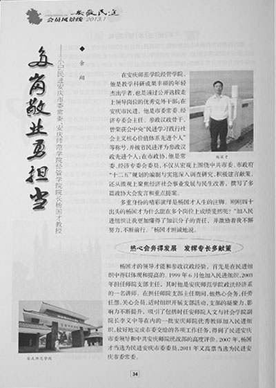 近日,《安徽民进》杂志以“多岗敬业勇担当”为题大篇幅专文介绍了民进安庆市委常委、安庆市政协常委、威尼斯官网经济管理学院院长杨国才教授事迹。