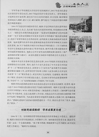 文章从杨国才教授发挥专长、深入调研,为安庆市经济社会发展、城市规划建言献策,创新思路促进学院专业建设、教学科研以及自身学术成果等方面介绍了杨国才教授,充分肯定了杨国才教授作为行政管理干部的创新开拓精神和作为一名民主党派成员的责任与担当。(陈广)