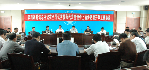 党委副书记、院长汪青松主持会议,并带领与会人员学习了胡锦涛总书记在全国优秀教师代表座谈会上的讲话。他指出,总书记的讲话是我国教育改革发展史上具有重要里程碑意义的大事。他要求全校要迅速掀起学习贯彻胡锦涛总书记重要讲话精神的热潮,抓学习、抓宣传、抓落实;要通过广播、报纸、网络等媒体加大宣传力度,广泛动员全体师生认真学习、研讨讲话精神,撰写学习心得体会,并结合我们作为师范类院校的特色,将学习落到实处,按照总书记提出的“四点希望”,在各自岗位上扎实工作,为我国教育事业的改革发展作出新的更大贡献。