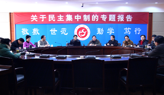 张荣国同志在报告中结合对十七大精神的学习,从民主集中制的来历、民主集中制的作用和地位、民主集中制的主要内容、民主集中制要处理的七大关系、高校党委领导下的校长负责制等十个方面阐述了民主集中制在我党及我国发展建设中的重要作用,全面分析了民主集中制的内涵、基本原则、发展目标、坚持民主集中制的重大意义和中国共产党对民主集中理论的创新和发展等问题。张荣国同志指出,民主集中制是马克思主义认识论和群众路线在党的组织建设和制度建设上的创造性运用,它涵盖了党的“五大建设”,是以改革创新精神加强党的建设的重要法宝,是中国共产党治国、治军的重要法宝。