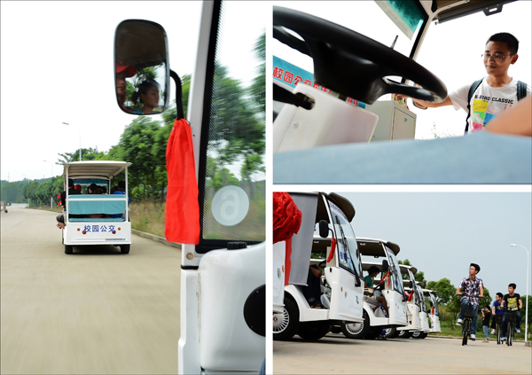 9月1日上午,汪昊从家里来学校报到,刚刚从南门下车的他手上肩上全是行李,没走几步就已经气喘吁吁、满头大汗。当他挪进学校大门后,眼前停着的几辆白色靓丽的电动车让他眼睛一亮,这几辆车和他在景区里坐的“旅游观光车”一样,白色靓丽,只不过车前身贴有“school bus”字样,车后印着“校园公交”几个字。