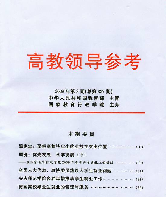 日前,由中华人民共和国教育部主管、国家教育行政学院主办的《高教领导参考》期刊于2009年第8期以“安庆师范学院多种举措推动学生就业工作”为标题,重点报道威尼斯官网毕业生就业工作新措施。
