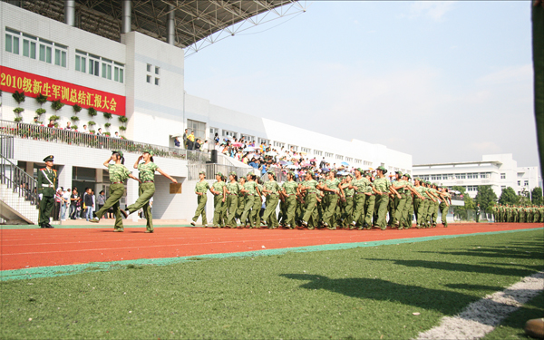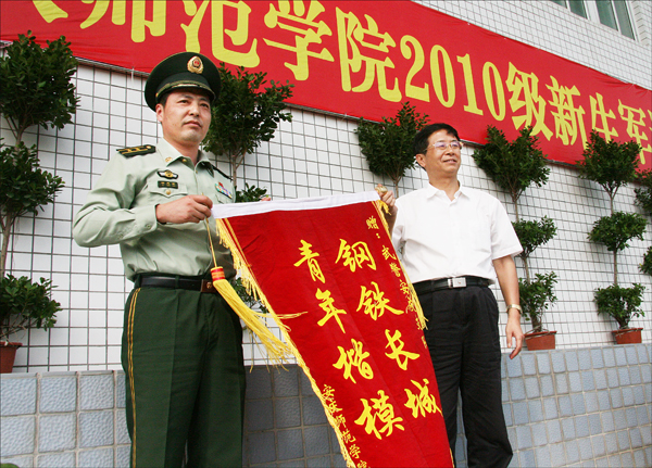 9月24日上午,在龙山校区塑胶运动场,5800余名2010级新生身着迷彩服,在这里进行他们军训的最后一课——总结表彰。党委书记何小祥代表学校向武警安庆支队副支队长胡庆南赠送了锦旗。时新中副院长作军训总结讲话,他希望同学们“自觉地担负起时代所赋予的当代青年大学生的神圣使命,秉承‘敬敷世范,勤学笃行’的校训精神,快乐成长,健康成人,励志成才,走向成功,把自己造就成祖国和人民需要的栋梁之才”。党委副书记、纪委书记殷红宣读表彰决定,19个军训优秀连队、182个内务优秀寝室以及182名优秀学员受到了表彰。王海燕副院长主持总结表彰大会。