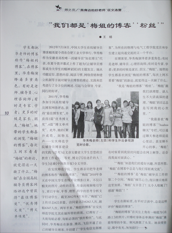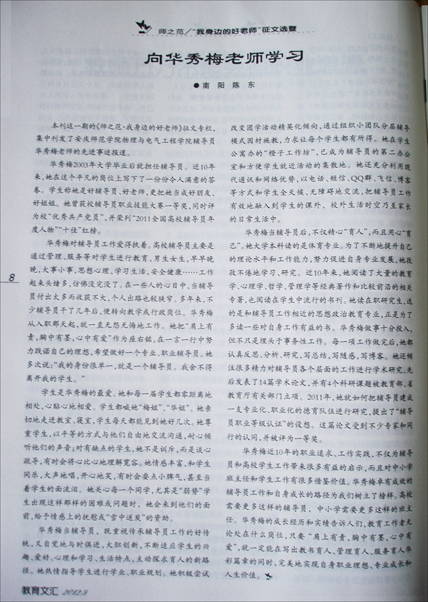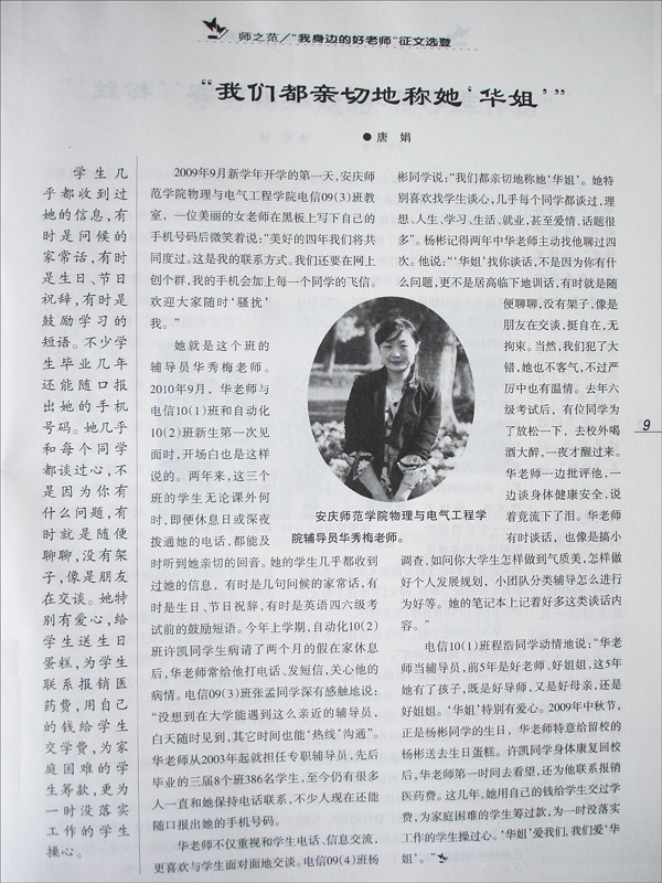 本刊这一期的《师之范·我身边的好老师》征文专栏,集中刊发了安庆师范学院物理与电气工程学院辅导员华秀梅老师的先进事迹报道。