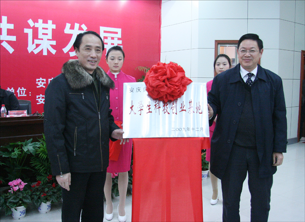 副院长时新中和安庆市科技局局长方争鸣共同为安庆师范学院大学生科技创业基地揭牌
