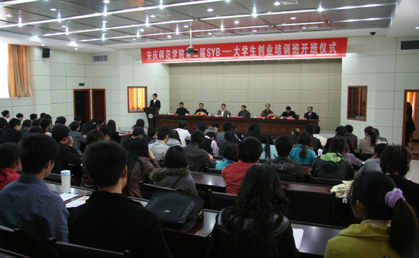 安庆市人力资源和社会保障局副调研员高宗胜在开学典礼上讲话。他指出,就业是民生之本,创业是发展之基,促进高校毕业生创业是实施人才强国战略的重要举措,也是保持经济又好又快发展的要求。为促进高校毕业生就业创业,市人力资源和社会保障部门将实施“岗位拓展计划”、 “创业引领计划”和“就业服务与援助计划”,逐步建立促进高校毕业生就业的长效机制。高调研员介绍,自2004年正式启动SYB创业培训以来,安庆市共举办创业培训班45期,316个班次,培训人数达9225人。他希望本期培训班学员要珍惜本次学习的机会,增强学习的主动性,注重学习的实效性。