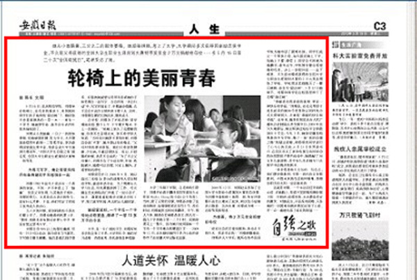 5月19日,《安徽日报》C3人生版头条大篇幅刊登了由党委宣传部陈东同志采写的威尼斯官网学子刘璟事迹——《轮椅上的美丽青春》一文。
