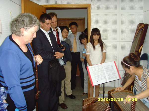 在音乐学院院长、黄梅剧艺术学院副院长荀安华、副院长刘蕊的引导下,客人一行还参观了艺术楼教室、琴房,饶有兴趣地观摩了马强伟老师的竹笛教学公开课,参观了数码钢琴教室,欣赏了学生的古筝表演,灵活多样的课堂教学形式,学生富有激情的弹奏表演,给美国客人留下了深刻的印象。