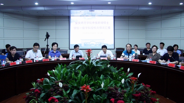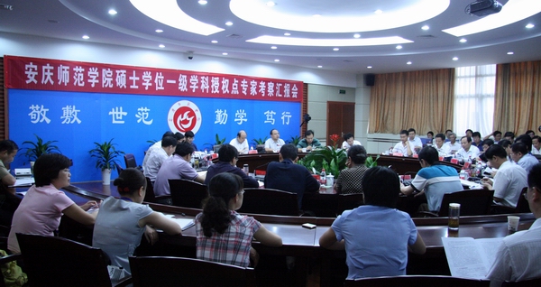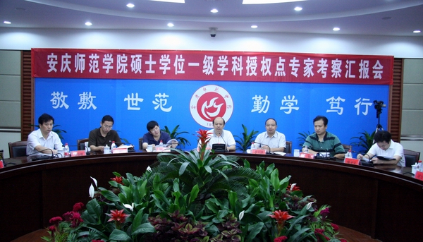 党委副书记、院长朱士群主持第一阶段的欢迎会,同时在第二阶段的汇报会上就学校的有关情况作了汇报。他相继介绍了学校、学位与研究生教育的相关情况,政治学、中国语言文学、数学、化学、教育学五个本次申请新增一级学科硕士学位授权点学科的基本情况,并阐述了五个学科的特色与优势。他指出,安庆师范学院的学科建设已具备扩展为相应的硕士学位一级学科授权点的实力,多年的快速发展已经为设置硕士学位一级学科授权点奠定了良好的基础。他认为,新增硕士学位一级学科授权点对安庆师范学院拓展发展空间、提升办学水平,为皖西南经济和社会发展构筑新的人才培养高地,对优化安徽省研究生教育布局都具有重要意义。