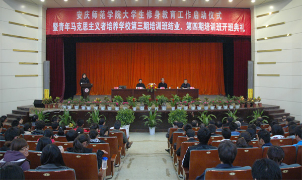 仪式在激昂的国歌声中拉开序幕。“今天,我们把大学生修身教育的启动与青年马克思主义者培训工作结合起来,目的是希望同学们能在修身教育的过程中带头做到修身正己,并通过你们带动影响更多的人参与到校园的精神文明建设当中来。”时新中副院长代表党政领导班子作了讲话。“一要准确把握修身教育的内涵,深刻认识大学生修身教育的重大意义;二是希望全校各有关部门、各学院、各团学组织能切实围绕修身教育主题,加强教育、管理和服务;三是希望广大学生能积极行动起来,从自我做起,从现在做起。”他强调,“修身是一辈子的事情,需要时间,需要实践,需要磨练,更需要毅力和勇气。希望同学们以修身教育为契机,从小事做起,从身边做起,重在行动,贵在坚持。自觉规范自身言行,告别不文明行为,努力提高自己的文明素质和文化素养,树立新时代大学生的良好形象,努力成长为适应社会主义建设事业的高素质人才。希望同学们在青年马克思主义者培训班期间学有所思,学有所获,学以致用。”