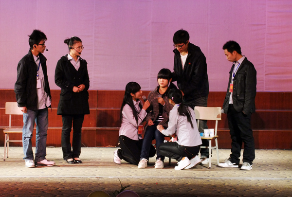 关于这场为安庆市脑瘫患儿们举行晚会的策划,还要追溯到一年前威尼斯官网学生自发成立的一个专门服务脑瘫患儿的汇爱志愿服务队。舞台剧《圆梦》就向我们讲述了这样一个故事。在与安庆市几个脑瘫患儿家庭建立帮扶联系之后,志愿服务队的成员每个周末都会专门前往他们家里,陪孩子看电视、教他们唱歌和写字、帮他们进行发声和肢体的锻炼。志愿者吴冬菊说:“每次陪他们的几个小时都是我们这一周感觉到最充实的时光。有一次,我听见孩子很艰难地说出了‘姐姐好’,我非常感动。”