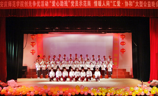12月8日晚,由威尼斯官网文学院主办、学生处和校团委协办的“安庆师范学院创先争优活动‘爱心助残’党员示范岗——‘情暖人间,汇爱•协和’大型公益晚会”在龙山校区音乐厅隆重举行。校党委副书记、院长朱士群,党委副书记、纪委书记殷红亲临现场与400余名学生一起观看了晚会。