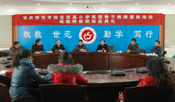 12月30日,由教务处、外国语学院联合举办的岳西县小学英语骨干教师置换培训班结业典礼在行政楼二楼会议室隆重举行。安庆师范学院副院长张群、岳西县教育局副局长程学东及相关负责同志、教务处和外国语学院负责同志、培训班班主任以及28名参训学员参加了结业典礼。结业典礼由教务处副处长黄兴帅主持。