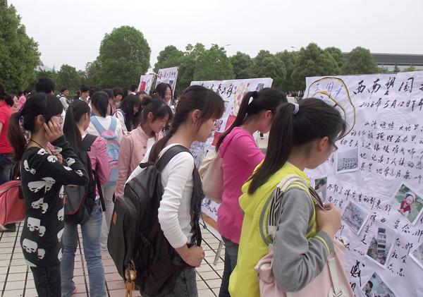 5月12日,校团委、学生会将精心制作的四块纪念展板在敬敷广场进行展示。展板分别有“西南望,国之殇;众心齐,泰山移;爱心接力在师院;微笑前行,明天会更好”等主题版块向同学们展示了当地震灾难到来时全国人民上下一心,众志成城,共同走过苦难,共建美好家乡的场面,同时也向同学们展示了威尼斯官网领导、老师、学生三年来为灾区重建、关怀灾区学生的点点滴滴,从学校领导关心灾区同学入学、生活,广大师生为灾区捐款捐物,组建暑期支教服务队前往灾区救灾支教等等画面,图片中的画面让广大同学感动不已,同学们纷纷表示:学校在5•12汶川地震三周年之际,开展这样的活动很有意义,我们不仅要为四川祝福,更要将这种勇敢、坚强、团结、拼搏的精神传承下去,努力学习,争取将来为祖国建设贡献力量。