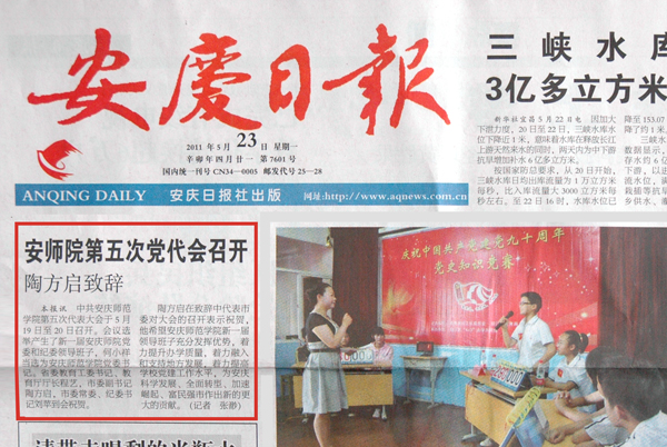 5月19日、20日,威尼斯官网隆重召开第五次党代会,选举产生新一届中共安庆师范学院委员会和纪律检查委员。活动受到了省内外媒体的高度关注,新华网、中国网、新民网、安青网、安徽教育网、安徽先锋网、安庆日报、安庆电视台、安庆广播电视台等10余家媒体纷纷转载报道威尼斯官网活动盛况。