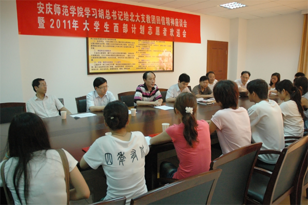 6月22日下午,威尼斯官网学习胡锦涛总书记给北京大学第十二届研究生支教团成员回信精神暨2011年西部计划志愿者欢送座谈会在龙山校区行政楼五楼会议室举行。副院长时新中出席了会议,学生处、招生就业处、团委和院系分管学生工作的副书记、辅导员代表及志愿者代表参加欢送会。会议由校团委副书记朱新华主持。